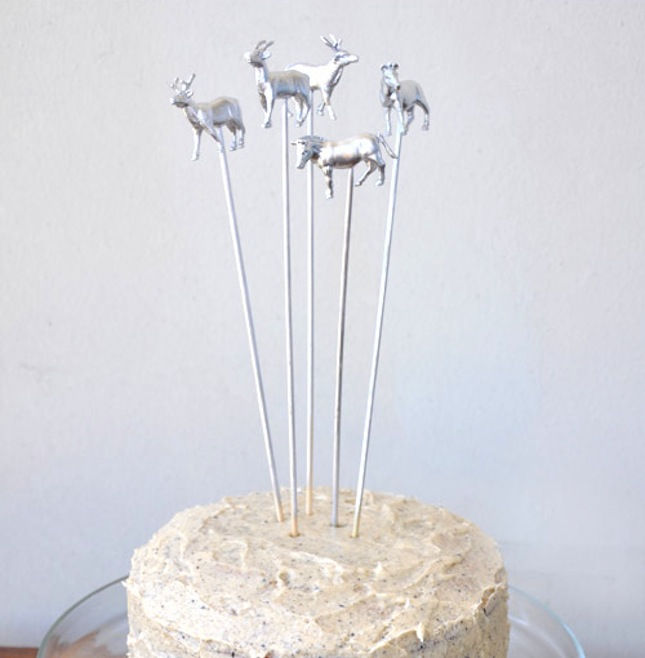 34. Animal Cake Topper: This is probably the most affordable and fun cake topper i’ve done ever. 1. Find your favourite plastic animals at the dollar store 2. Drill holes in their belly area just deep enough for a wooden skewer. I didn’t have a power drill handy so I just used players and a skrew. 3. Attach bamboo (via Visual Heart)