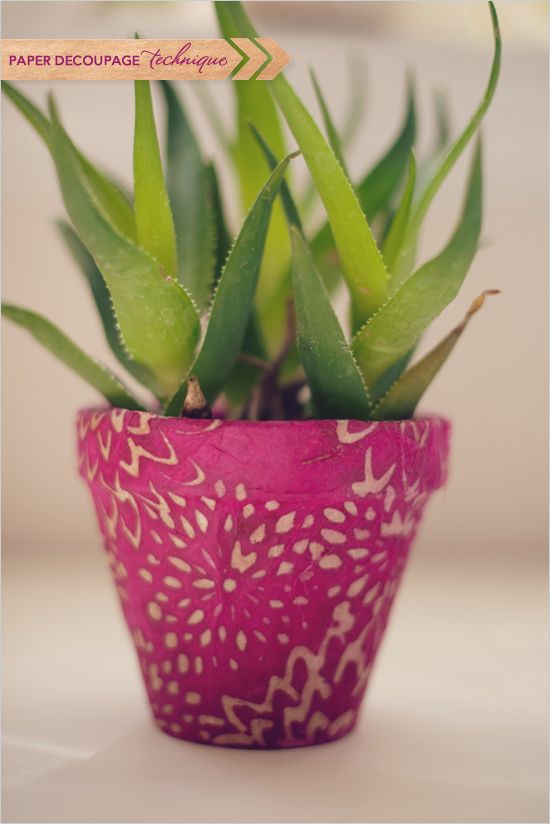 19. Decorate Terra Cotta Pots: DIY Terra Cotta Pots – Here we teach you how to diy gold leafing and diy decoupage, (via Wedding Chicks)