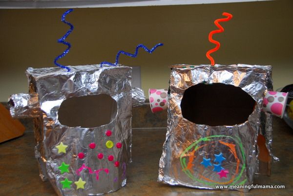 46. Robot Mask: This DIY robot mask is a craft that kids of all ages will enjoy. It is made from a simple paper bag, covered in foil and adorned with their own choice of decorations. (via Meaningful Mama)