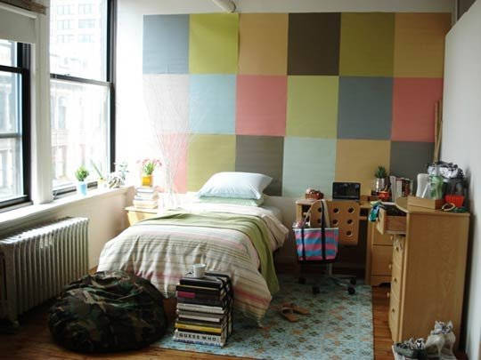 15. Construction Paper Grid Wall: We’ve kept this image from Danny Seo’s blog in our archives for a long time just waiting for the right moment to use this bit of inspiration. We love that Danny was able to transform a dorm room into something warm, fun and graphic with just one material, very little money and a little bit of time: (via Apartment Therapy)
