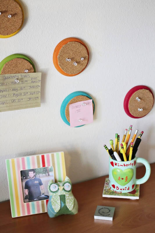 11. Colorful Circle Cork Boards: A while back I found this wooden disks, I am guessing they are for some part of furniture making. I bought them at a local thrift store for 50 cents a piece. I had come left over cork board, and decided to make some fun and colorful mini cork circle boards. They are about 4 inches each, … (via Trashy Crafter)