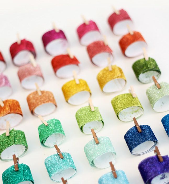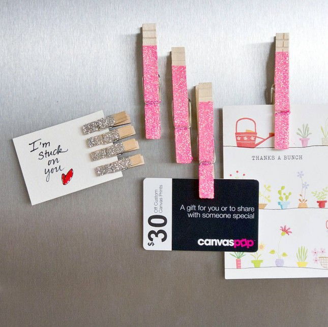 15. Glitter Clothespin Magnets: Update your work or home with sparkling clothespin magnets that help keep your favorite pictures or important notes organized. This DIY is so simple, and the finished magnets can also be packaged together as a special homemade gift. Use your favorite (via Popsugar)