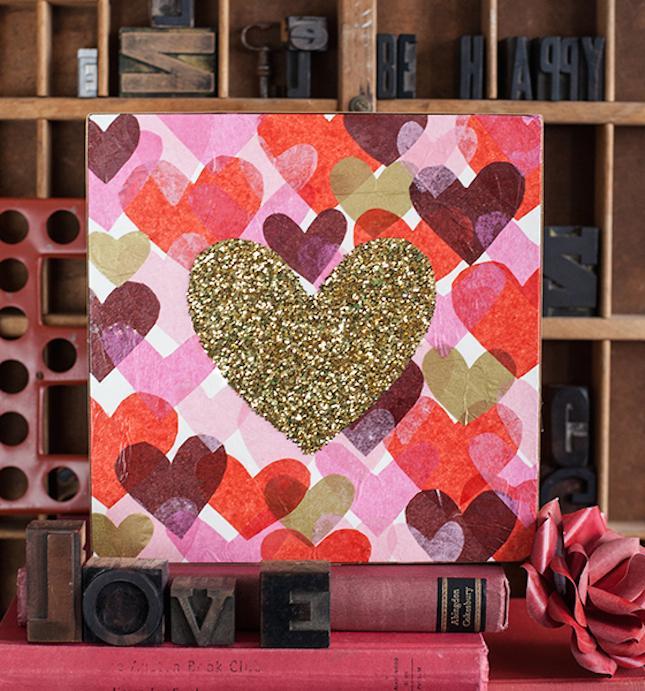 32. Glitter Heart Art: A perfect DIY Valentine’s Day gift! Make heart wall art using tissue paper, glitter, and decoupage. Learn how with our easy step by step tutorial. (via The Elli Blog)