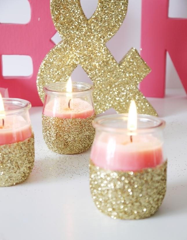 33. Glitter Candle Holders: TUTORIAL: DIY Pink Candles and Glitter Candle Holders (via Bird’s Party Blog)