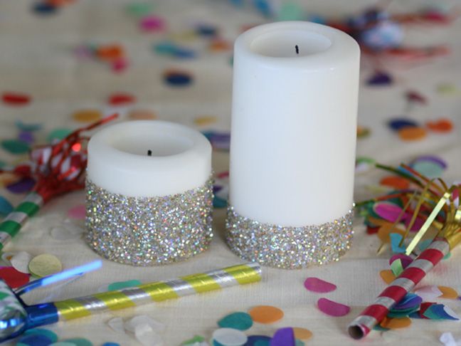 43. Glitter Candles: Nothing says New Years Eve like a little glitter added to your everyday home decor. This is a really simple (read: five minute!) project that instantly transforms your plain white candles, and the result is so fun! Keep reading to see how to make them Supplies: Wax candles Scotch tape Glitter Spray Adhesive Paper Wrap (via Momtastic)