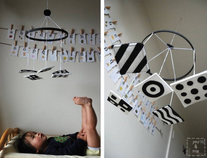 43. Black and White Mobile: Hello Nap Time Crafters! My name is Cherie and I have a lil blog called you & mie where I blog about sewing and crafting, an occasional recipe or personal story, but mostly about my current passion, kids clothing. I’m so excited to be here with you with you while Amy is on maternity leave. Projects for newborns have a special place in my heart (via Peek-a-Boo Pages)