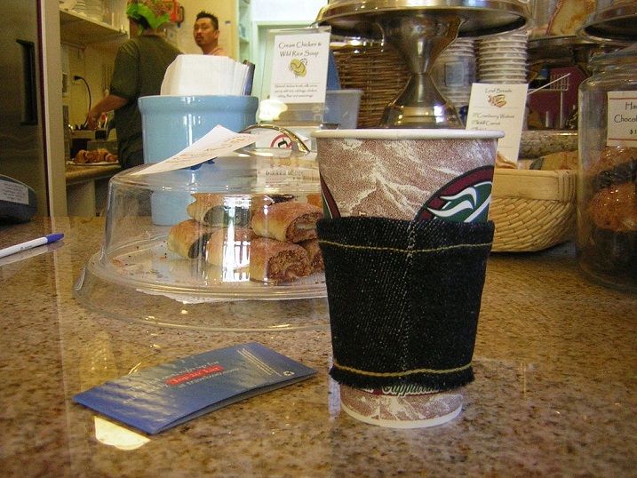 39. Coffee Cozy: Ive always felt a little wasteful for heavily using those disposable coffee cup cozies, so I decided to make my own using scraps from tailored jeans. Introducing the worlds first selvage coffee jacket! Of course I used scraps from raw denim jeans that I had tailored, and I used the new chain stitch machine for (via Doc Pop Dot Org)
