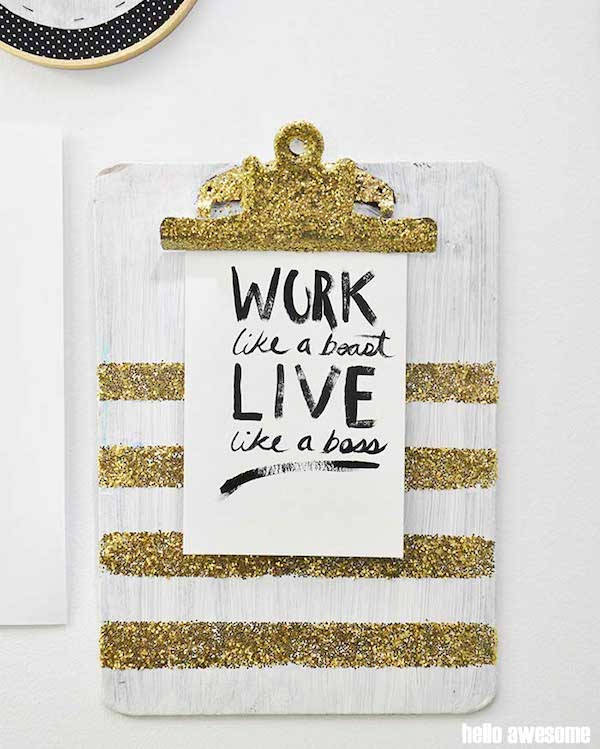39. Clipboard Bombed with Glitter: Jacy loves bombing things with glitter! So much that she made this DIY clipboard with the chunky gold kind. See how she made this easy project. (via DIY Candy)