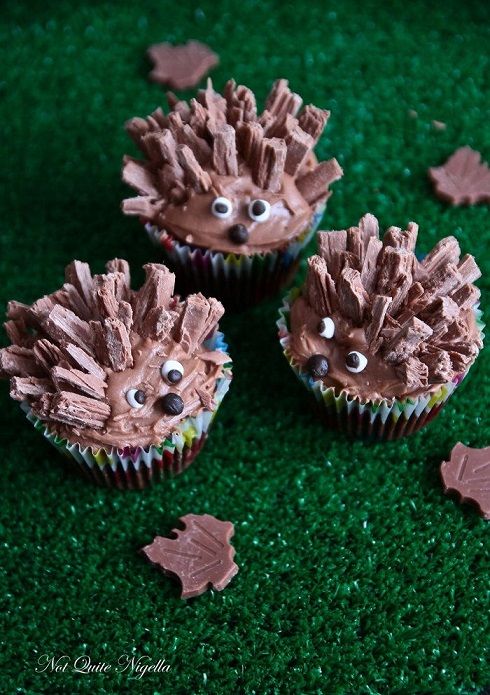 31. Chocolate Hedgehog Cupcakes: I quickly pulled out a Flake bar and chopped it up seeing if it could simulate hedgehog or porcupine quills. I popped in two eyes from a supply of ready made eyes from my repository and asked Mr NQN what he thought. Thankfully he recognized them straight away as did the girls who covered their pink cheeks and mouths with chocolate. And who thankfully didn’t comment about Auntie Lorraine wearing pajamas! (via Not Quite Nigella)