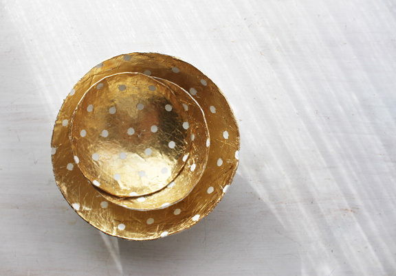 32. Gold Leaf Paper Mache Bowls: So, I think this might be my favorite DIY to date. It’s just so practical and pretty! A few friends and I decided we would get together once a month for an all day craft day. Just to create prett… (via Kelli Murray)
