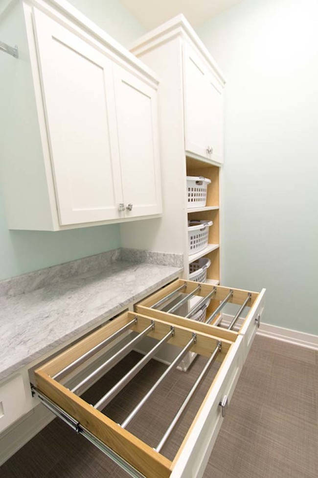 22. Turn drawers into drying racks with bars: Stunning laundry room with laundry basket cubbies alongside pull-out drying racks framed by white cabinetry accented with nickel hardware and gray marble counter tops. The floors are tiled in taupe linen textured floors tiles below walls painted pale blue. (via Decor Pad)