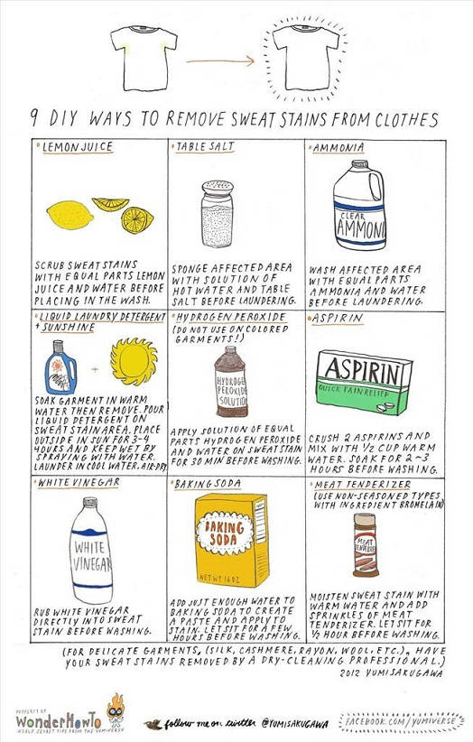 31. Ways to Remove Sweat Stains from Clothes: Got a bad sweat stain on the underarms of your light-colored clothing? You probably have something in your kitchen or medicine cabinet that will help get rid of the stain immediately. Aspirin, table salt, lemon juice, white vinegar, baking soda, and even meat tenderizer (make sure it is unseasoned!) are some of the many common household ingredients you can use to make your sweaty clothes look brand new again. Take note: these methods work best for washable, durable fabrics. Make sure not to use hydrogen peroxide on colored clothes, as they tend to have a bleaching effect. For more fragile (via WonderHowTo)