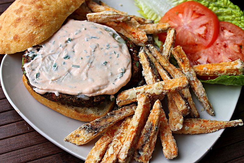 47. Black Bean Burger with a Sriracha Sauce: I hope you all love the new design as much as I do! I love that there are handy printables for the recipes now! (via Fabtastic Eats)