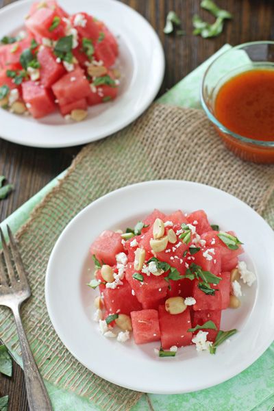 27. Watermelon Salad With Sriracha Vinaigrette: Recipe for watermelon salad with sriracha vinaigrette. Sweet watermelon, salty feta, peanuts and arugula in a super easy summer salad. (via Cookie Monster Cooking)