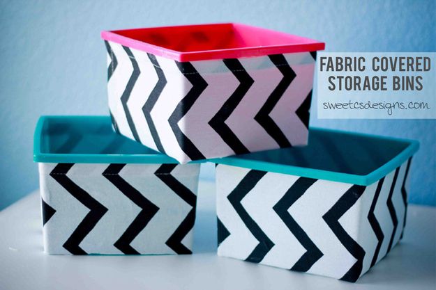 44. No Sew Covered Fabric Bins: I am on a huge kick lately- my sewing machine is feeling a little neglected because I have shunned her for my new addiction- fabric mod podge. I know, I know, I posted last week about my new bestie- but you aren’t out of the mod podge woods yet- because today I have another fabulously (via Sweet C’s Designs)