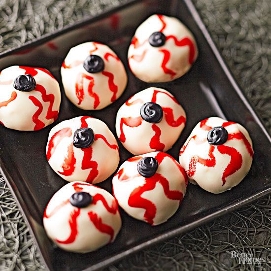 7. Bloodshot Peanut Butter Eyeballs: Create a spooky spread of these Halloween party food recipes to transform a dreadfully dull holiday party into a frightfully fun evening with your favorite ghouls and guys. Easily feed guests of all ages with these fast-to-fix Halloween party food recipes. (via Better Homes and Gardens)