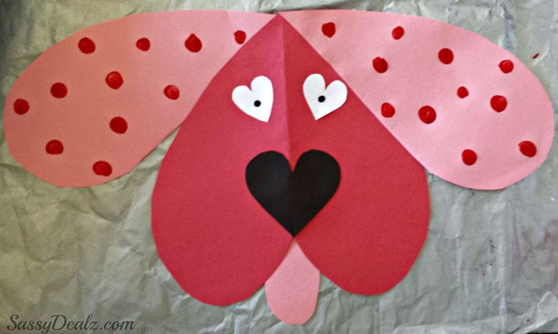 37. Valentines Puppy: Materials Needed: Red, Pink, White, Black Construction Paper Scissors Glue Black marker Start by cutting out two big red and pink hearts from construction paper. Cut the pink heart in half to make the dogs floppy ears. After that cut out a smaller black heart for the nose and two little white hearts for the (via Crafty Morning)