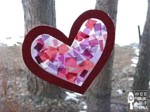 36. Tissue Paper Stained Glass Hearts: Materials: Tissue Paper (pink, red, white) Construction Paper (pink, red, white) Clear Contact Paper Scissors To create this pretty stained glass widow hangings you will need start by cutting pink, red and white tissue paper in approximately 1/2 to 1inch squares. Note: a little goes a long way. Fold a sheet of construction paper in (via Wee Folk Art)
