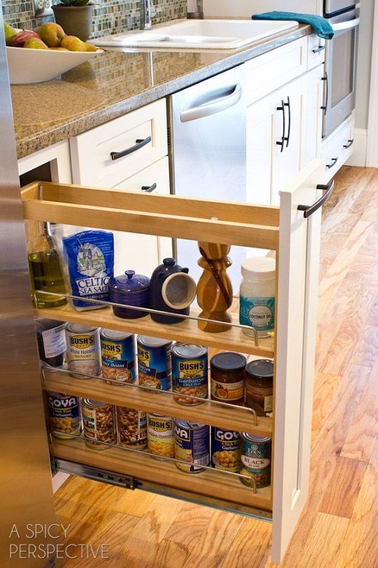 13. Narrow Roll Out Rack for Cans: Yesterday, I shared photos of my brand-spanking-new kitchen. Today let me tell you about the cabinetry. This whole remodel endeavor started with a need for (via A Spicy Perspective)