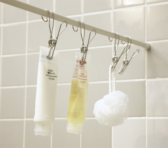 23. Use shower curtain rod to hang bath toiletries (via Muji)
