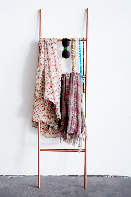 3. Copper Metallic Scarf Storage Ladder: This is the easiest project ever.I swear. You will love it.Go to Home Depot and just snag up three wood dowels. (Go HERE to buy them online.) Hobby Lobby sells them too for about the same price. I like the ones that are about 4 feet tall, but they (via natalme)
