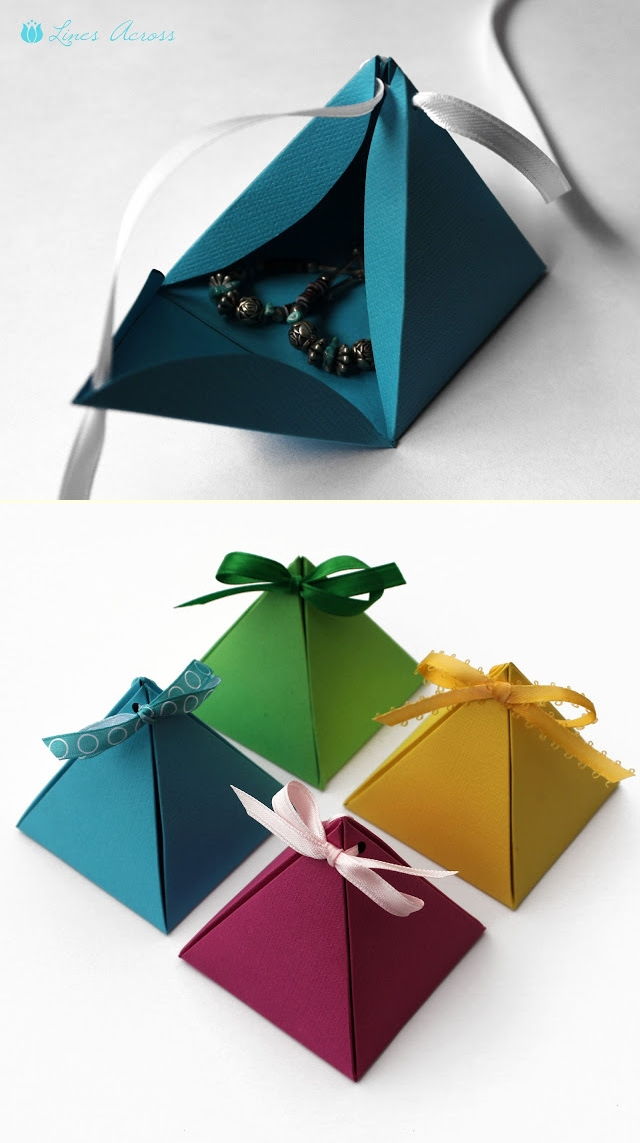55. Paper Pyramid Gift Boxes: These paper pyramid gift boxes are so unique and really easy to assemble. They also come with a free printable template. (via Lines Across)