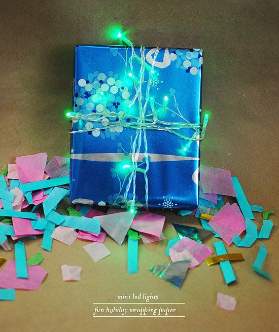 29. Mini LED Lights Gift Wrap: My favorite thing about giving gifts is wrapping them. I don’t know why, but I’ve always loved figuring out fun ways to adorn a gift other than with the usual bow. For example, I got these mini-LED lights to wrap… (via Oh Joy!)