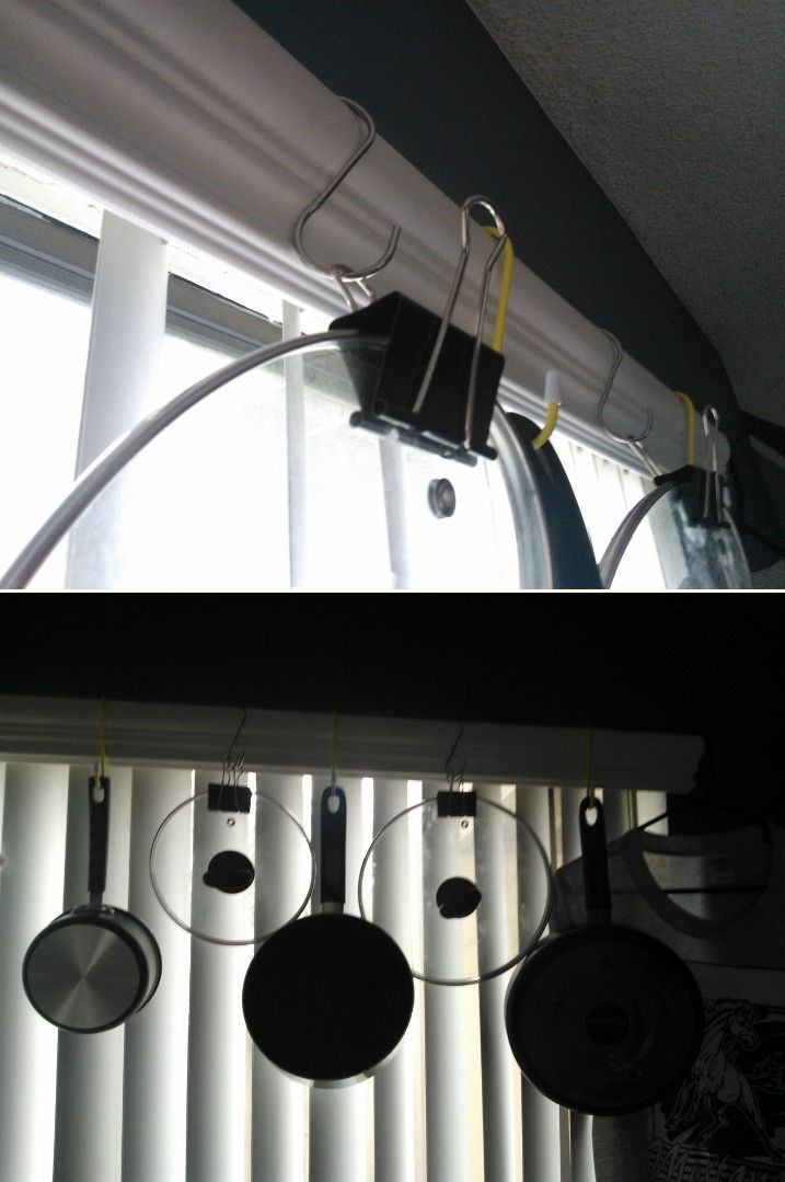 38 Hanging pots, pans, and their lids on bedroom curtain