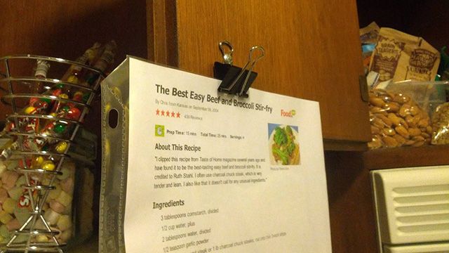 39. Hang Recipes From a Cabinet Door: With the explosion of food blogs in the last couple of years, there are more recipes available at the tip of your fingers than ever before. Craving chocolate chip cookies or Sriracha-flavored anything? You’re guaranteed to have several thousand versions to choose from. So that’s how they did it before the Internet… If you like to print out recipes to reference while you cook, it can be difficult to find a convenient place where they’re easy to see and don’t get in the way. But with a little modification, your kitchen cabinets make perfect recipe holders. Here are just three quick and easy (via WonderHowTo)