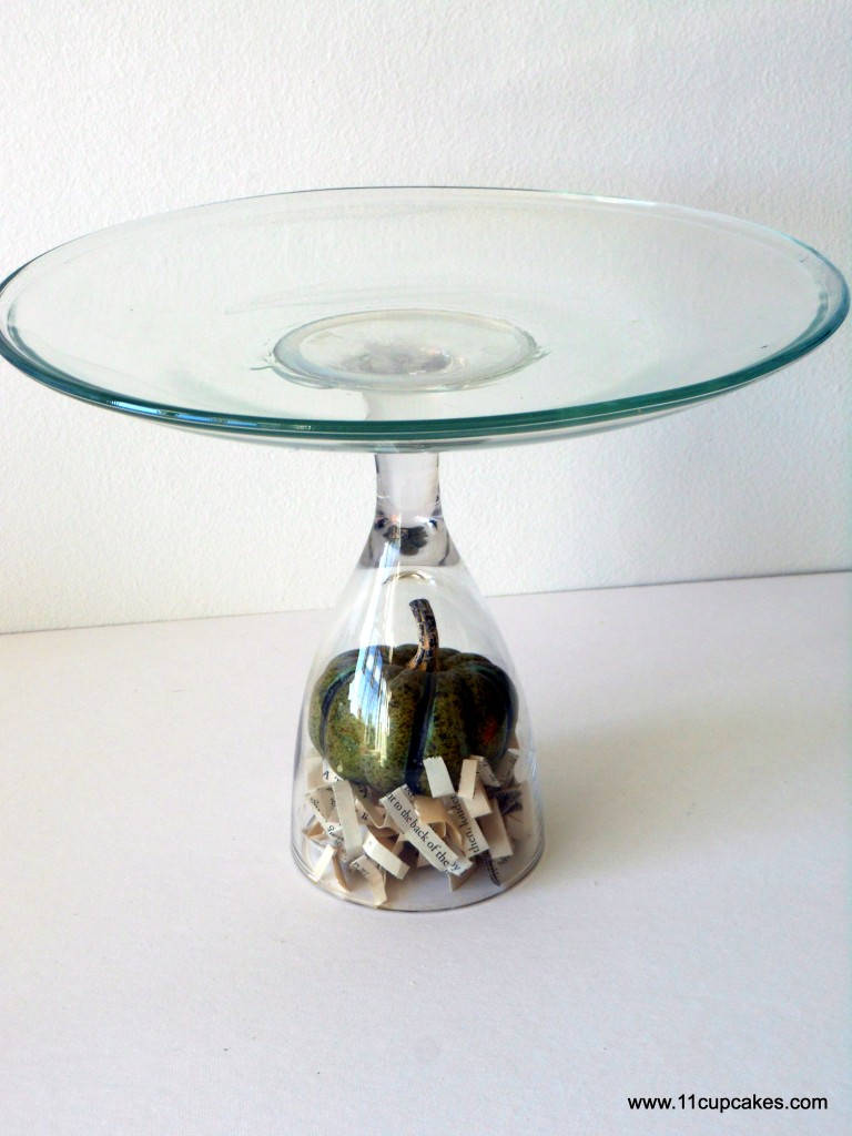 7. Glass Cake Stand: This week is full of DIY ideas to create your perfect handmade tables-cape at your next party. Today we’re sharing our idea for a terrarium style cake stand made from a wine glass and glass plate. … (via 11 Cupcakes)