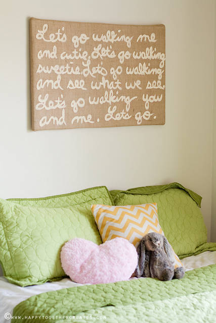 37. Burlap Canvas: I am still ever so slowly adding touches to our home decor, but I’m almost happy with our baby/guest room. I wanted to add something above the bed and decided to make this. The final design came down to one thing: what I already had. I had originally wanted to use a linen fabric, but (via Happy Together)