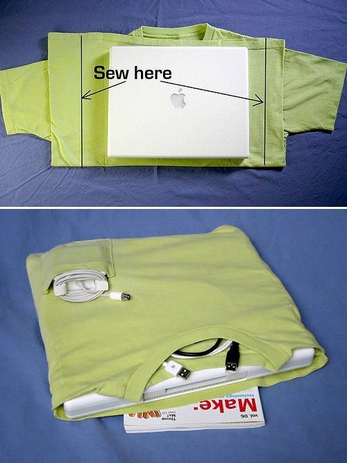 27. T-Shirt Laptop Case: Voxphoto writes – “In the t-shirt laptop case shown in MAKE #06, on page 27, it looks like the laptop fits in long way round–but the way I made it, the di (via Make)