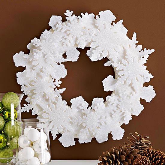 2. Simple Felt Snowflake Wreath: Snowflake shapes cut from fluffy white felt help decorate a melt-free wreath that can be displayed for Christmas or all winter long. (via Better Homes and Gardens)