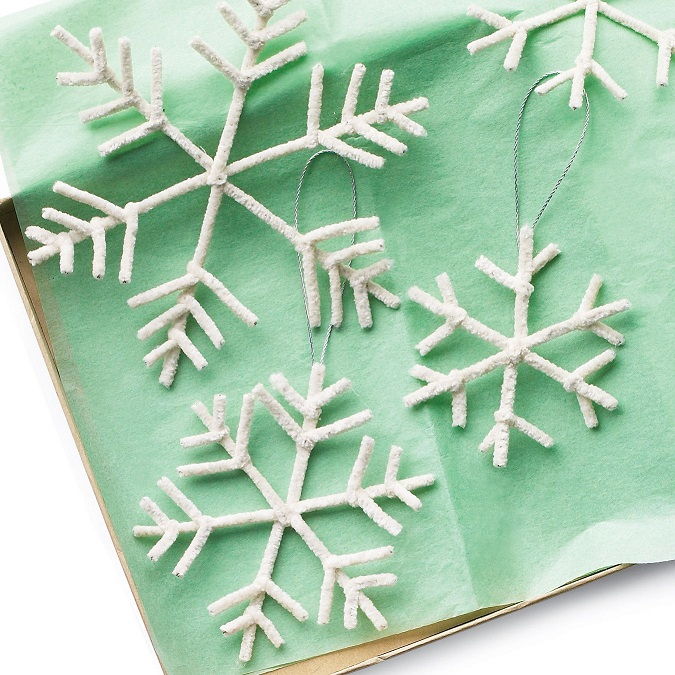 4. Pipe-Cleaner Snowflake Ornaments: These directions yield a snowflake that is 6 inches in diameter, with three arms attached to each spoke. To create larger or smaller snowflakes, simply adjust the proportions of the pipe-cleaner pieces accordingly. (via Martha Stewart)