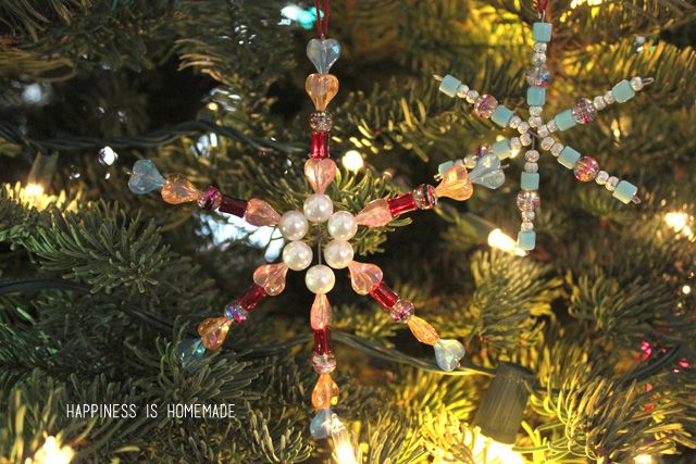 53. Beaded Snowflake Ornaments: These kid-made beaded snowflake ornaments are elegant and beautiful, but they are quick to make and require just a couple of basic supplies! (via Happiness is Homemade)