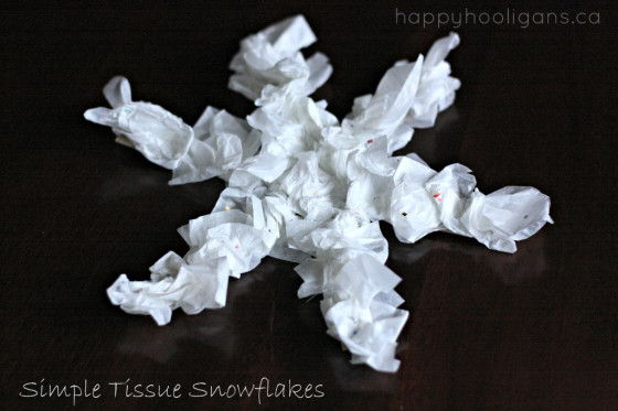 26. Simple Tissue Paper Snowflake: We made these simple tissue paper snowflakes late this afternoon after one of the hooligans’ parents surprised us with a generous supply of tissue paper. (via Happy Hooligans)